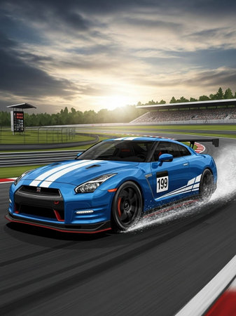 3D rendering of a blue sports car racing on a track.