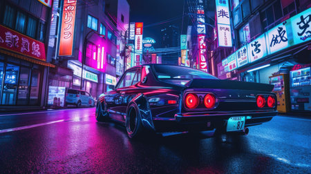 Japanese car with tuning. Against the background of neon signs of the city. AI generative.