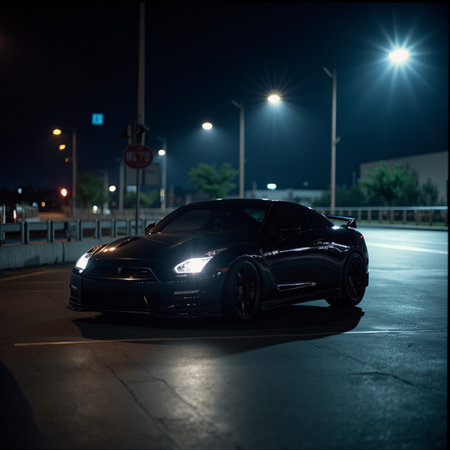 Side view of a black sport car parked on the street at night