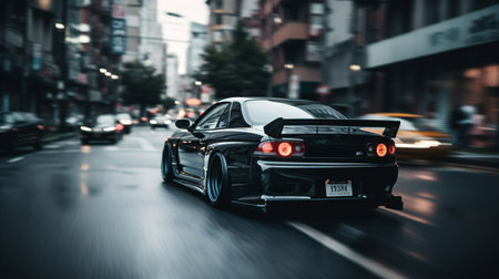 An AI generated illustration of a sleek black sports car driving down a city street