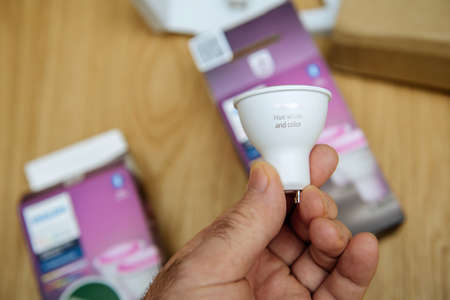 POV male hand holding new Philips Hue GU10 color lamp right after unboxing