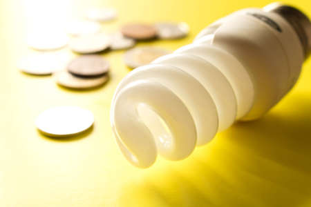 Energy saving lamp with coins on a yellow background. Close up. The concept of energy saving.