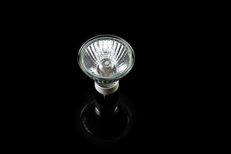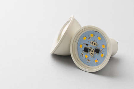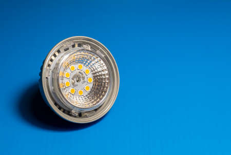 Close up of a led spotlight on a blurred surface, selective focus, led bulb, 5W, high energy efficiency, copy space, blue background, horizontal