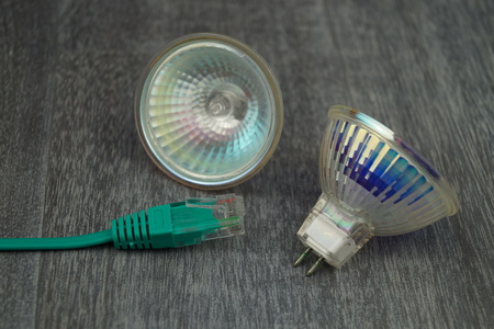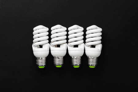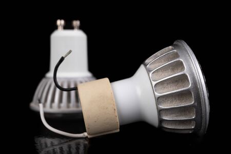 LED bulbs on a dark table. LED lighting and connectors for the energy source. Black background.