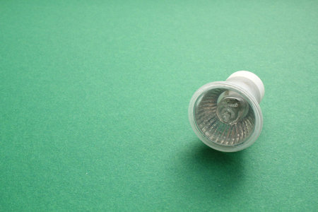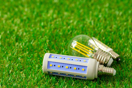 Electric LED light bulb lamp on green background with copy space. Eco saving power and environmental conservation energy efficiency concept. Ecological friendly and sustainable lif