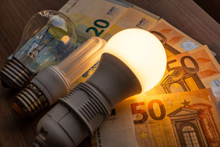 LED bulb on, with fluorescent bulb and incandescent bulb, with bills and coins next to it. Energy costs and evolution of light bulbs.