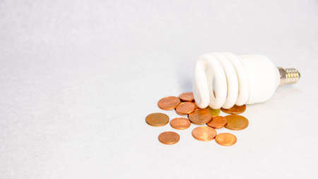 Close-up of a led light bulb on various coins on white background. Concept of energy saving at home.