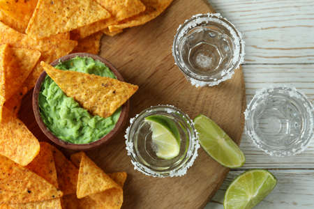 Party concept with tequila, guacamole and chips