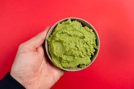 Top view of a ceramic bowl filled with the succulent guacamole sauce of Mexican origin on a red background.