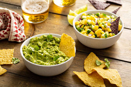 Tortilla chips with dips, guacamole and salsa