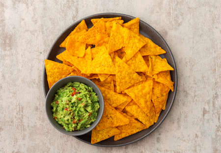 Corn nachos chips with avocado guacamole top view