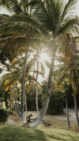 Coconut palm trees and a monkey on the island of Sri Lanka