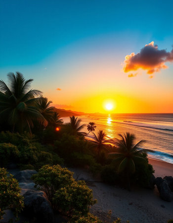 Beautiful tropical beach scene with palm trees, clear blue ocean waves, and a vibrant sky with fluffy clouds. Concept of travel and relaxation.