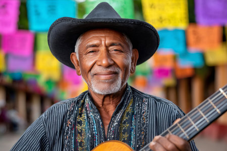 Portrait of a cheerful senior Hispanic man playing a guitar in a traditional Mexican town