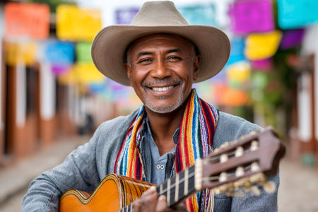 Happy man in traditional clothing plays guitar at lively celebration, with colorful confetti and musicians in background, showcasing rich cultural heritage and joyful atmosphere
