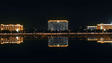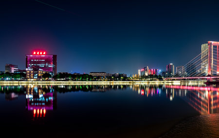 illuminated city waterfront downtown skyline with Haihe river,Tianjin,China.