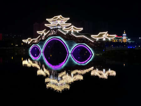 Beautifully illuminated Anshun Bridge across the Jin River in the evening in Chengdu, Sichuan province, China