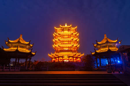 Night view of illuminated Cheng Huang Ge, also known as City God Pavillion, Hangzhou, China