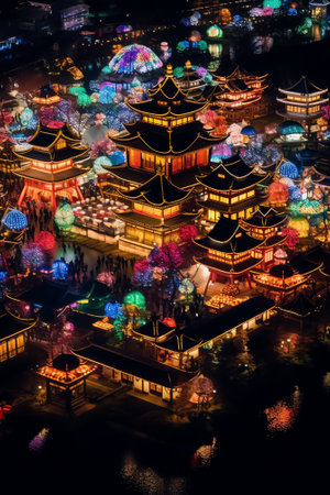 Aerial view of the city's ancient Chinese pagoda at night