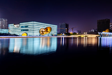 Modern city skyline, Ninbo, China at night.