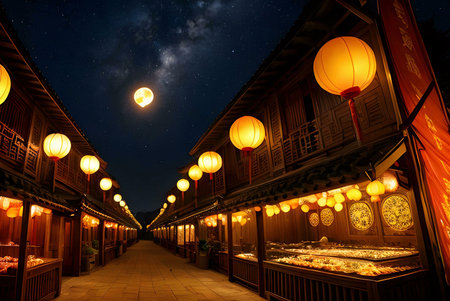 Picturesque night market in China, illuminated by warm lanterns under a starry sky and moon.