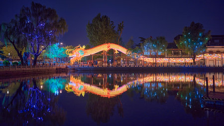 Illuminated dragon lantern reflecting on a calm Shichahai lake at night in central Beijing, China on 18 April 2024