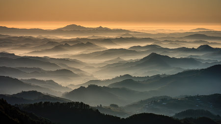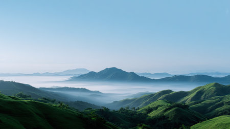 Misty mountain ranges create a serene landscape. A breathtaking view of nature's tranquility.