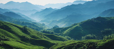 Scenic terraced tea plantations on lush green hills in a tranquil landscape
