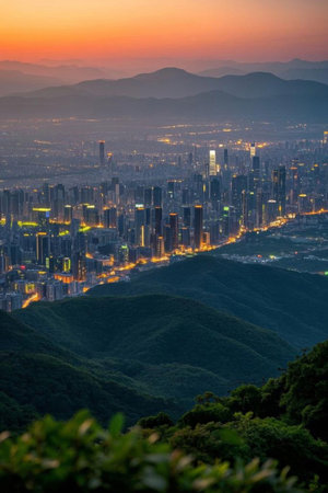 a stunning cityscape at sunrise captured in ultra high resolution photography. the mountains are adorned with clouds, creating a mesmerizing scene. the morning mist allows godrays to shine through, adding a touch of magic to the atmosphere. this epic shot was taken with a hasselblad camera using a wide angle lens. ai generated