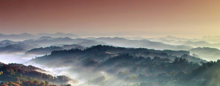 Panoramic view of the misty mountains in the morning light
