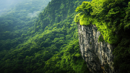 A captivating landscape showcasing dramatic cliffs shrouded in mist, surrounded by lush greenery under a moody, cloudy sky, evoking a sense of tranquility and beauty.