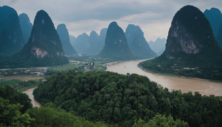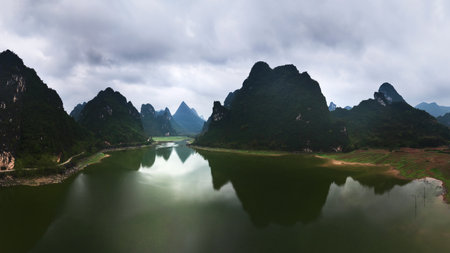 Panoramic view of karst mountains and Li river in Yangshuo, Guilin, China