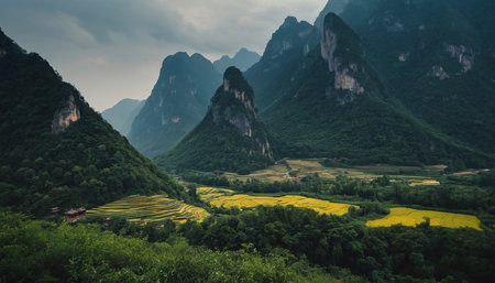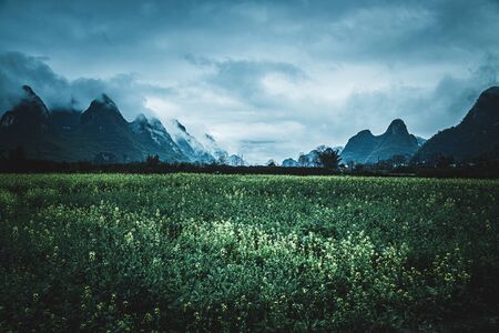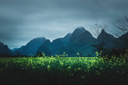 Beautiful impressive karst mountain landscape in Yangshuo before dusk on a sunny hot overcast summer day, Guangxi Province, China
