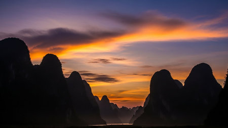 Amazing sunset over the karst landscape of Xingping, Guilin, China