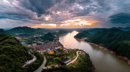 This breathtaking aerial view captures a river gracefully curving through lush green mountains, framed by a dramatic sunset sky filled with vibrant clouds.