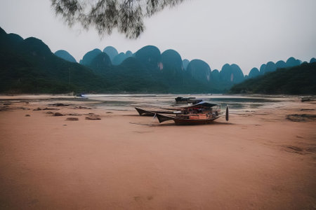 a large river flows peacefully, adorned with boats gracefully gliding around a majestic mountain. this enchanting scene captures the essence of gauzy atmospheric landscapes, reminiscent of ancient chinese art. the image, captured using schlieren photography, showcases stunning uhd quality and is bathed in atmospheric blues. a captivating associated press photo that evokes a sense of nostalgic romanticism. ai generated
