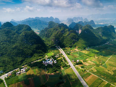 Scenic highway in Guangxi province of China surrounded with rice fields and karst rocks aerial
