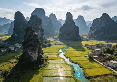 Early morning light washes over a picturesque karst landscape with a meandering river and vibrant green fields