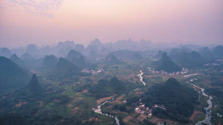 Xianggongshan Sunrise - Xianggong Mountain, Guilin Landscape, Li River & Karst mountains. Located near The Ancient Town of Xingping, Yangshuo, Guilin, Guangxi Province China. Fog and Mist, Mysterious