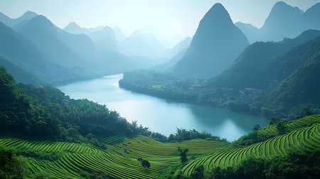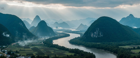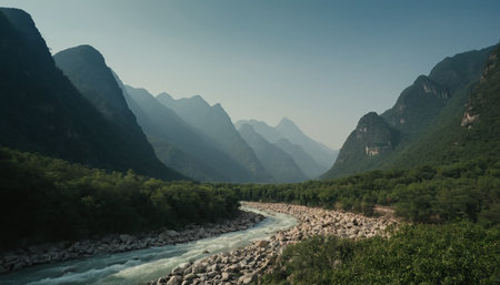 Majestic mountains frame a serene river at sunrise, with gentle mist rising from lush greenery. A tranquil landscape that inspires adventure and exploration.