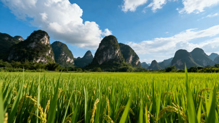 Karst mountains and rice fields in Yangshuo, Guilin, China