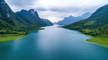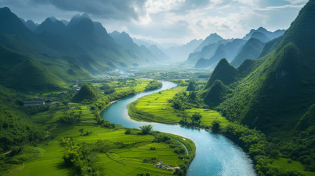 Aerial landscape in Phong Nam valley, Cao bang province, Vietnam with river, nature, rice fields, beautiful destination in Northern Vietnam - ai