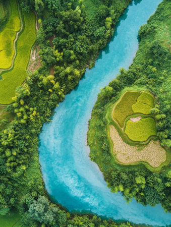 A breathtaking view of a winding river surrounded by verdant hills and mountains, showcasing the tranquility and beauty of nature in a pristine landscape.