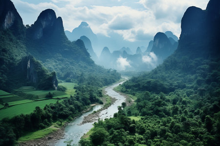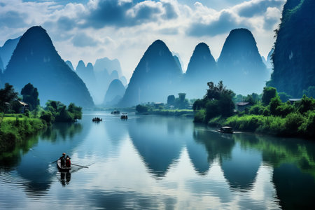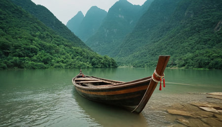 A tranquil river flows through a stunning landscape of misty mountains. A solitary boat drifts peacefully, surrounded by lush greenery and scenic beauty.