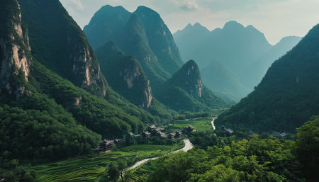 A sweeping vista of verdant, mist-shrouded mountains frames a traditional village nestled in a valley. Terraced rice paddies, a vibrant green, cascade down the slopes, leading to clusters of dark-roofed buildings with intricate architectural details. A winding road connects the settlement, disappearing into the lush landscape. The scene is bathed in a soft, diffused light, creating a sense of depth and tranquility.