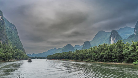 Tourist sail ships along the picturesque riverbed. Lush green vegetation on the shores. Mountains against the sky and clouds. Ripples on the surface of the water. China. Lee River.
