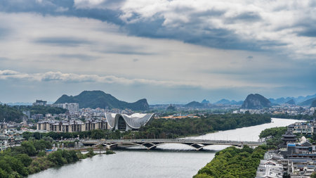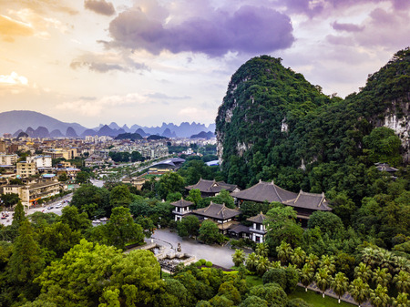 Summer landscape of Guilin town city with karst mountains in the background, Guangxi Province, China