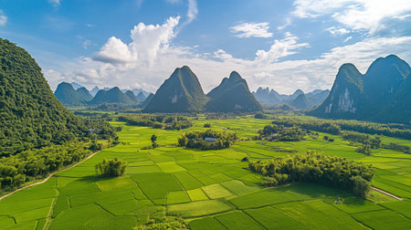 Panoramic aerial view of rice fields in Yangshuo, Guilin, China