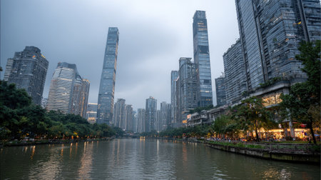 A panoramic view of a modern cityscape features numerous skyscrapers along a tranquil body of water. The cloudy sky casts a soft light across the scene, highlighting the textures of the buildings. The image depicts a contemporary urban environment with potential use for commercial and editorial purposes.
