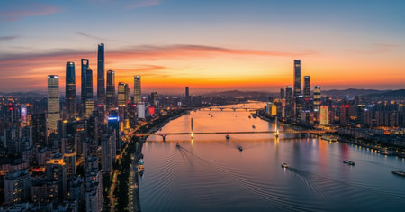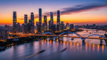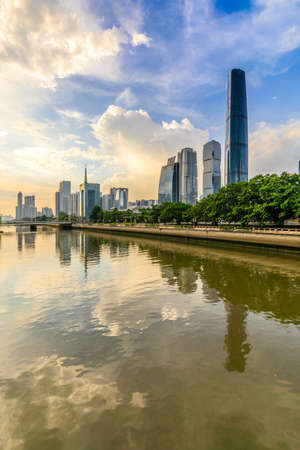 skyline and cityscape of modern city guangzhou during sunset at riverside